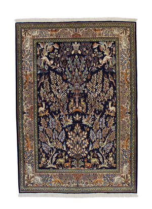 Dieser Teppich kommt aus der heiligen persischen Stadt Ghom, welche für besonders feine und exklusive Teppiche bei Sammlern auf der ganzen Welt bekannt geworden ist. Die verwendeten Materialen sind überwiegend Seide oder Korkwolle, besonders beliebt sind allerdings die Seidenteppiche aus reiner Naturseide. Die Seide lässt Farben je nach Lichteinfall in verschiedensten Facetten erstrahlen und wird dadurch zum absoluten Highlight in jedem Raum. Bekannte Manufakturen und Knüpfer signieren ihre Arbeit, wodurch der Teppich an Wert steigen kann. Die dichte Knüpfung und die hervorragenden Materialen sorgen dafür, dass der Teppich sehr strapazierfähig und langlebig ist.