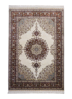 Dieser exklusive Teppich kommt aus China, wo bekannte türkische Provenienzen wie Hereke als Vorlage dienen. Verwendet wird nur die feinste Seide für den Flor und Schuss, wodurch dieser Teppich sehr fein geknüpft ist. Die Seide lässt die Farben je nach Lichteinfall in verschiedensten Facetten erstrahlen und wird dadurch zum absoluten Highlight in jedem Raum. Die dichte Knüpfung und Materialen sorgen dafür, dass der Teppich sehr strapazierfähig und langlebig ist.
