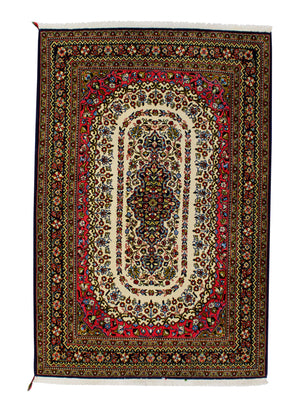 Dieser Teppich kommt aus der heiligen persischen Stadt Ghom, welche für besonders feine und exklusive Teppiche bei Sammlern auf der ganzen Welt bekannt geworden ist. Die verwendeten Materialen sind überwiegend Seide oder Korkwolle, besonders beliebt sind allerdings die Seidenteppiche aus reiner Naturseide. Die Seide lässt Farben je nach Lichteinfall in verschiedensten Facetten erstrahlen und wird dadurch zum absoluten Highlight in jedem Raum. Bekannte Manufakturen und Knüpfer signieren ihre Arbeit, wodurch der Teppich an Wert steigen kann. Die dichte Knüpfung und die hervorragenden Materialen sorgen dafür, dass der Teppich sehr strapazierfähig und langlebig ist.