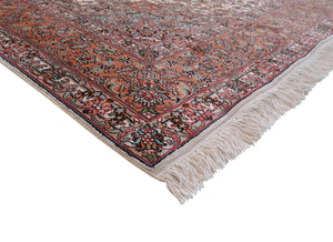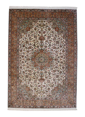 Dieser Teppich stammt aus Kaschmir, wo bekannte persische Provenienzen als Vorlage dienen. Hochwertige Materialen wie Wolle und Seide sorgen dafür, dass diese Teppiche sehr beliebt bei Teppichliebhabern geworden sind. Das typische Motiv besteht meist aus einem Medaillon oder dem Gartenmotiv. Je nach Feinheit wird für den Schuss Baumwolle oder sogar reine Seide verwendet. Die Seide lässt die Farben je nach Lichteinfall in verschiedensten Facetten erstrahlen und wird dadurch zum absoluten Highlight in jedem Raum. Die dichte Knüpfung und Materialen sorgen dafür, dass der Teppich sehr strapazierfähig und langlebig ist.