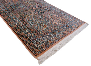 Dieser Teppich stammt aus Kaschmir, wo bekannte persische Provenienzen als Vorlage dienen. Hochwertige Materialen wie Wolle und Seide sorgen dafür, dass diese Teppiche sehr beliebt bei Teppichliebhabern geworden sind. Das typische Motiv besteht meist aus einem Medaillon oder dem Gartenmotiv. Je nach Feinheit wird für den Schuss Baumwolle oder sogar reine Seide verwendet. Die Seide lässt die Farben je nach Lichteinfall in verschiedensten Facetten erstrahlen und wird dadurch zum absoluten Highlight in jedem Raum. Die dichte Knüpfung und Materialen sorgen dafür, dass der Teppich sehr strapazierfähig und langlebig ist.