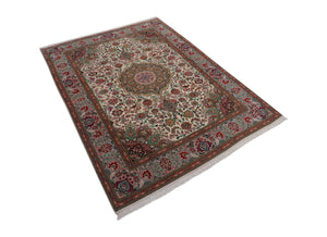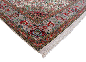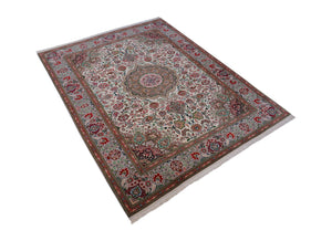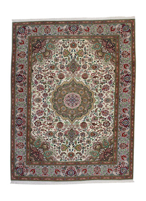 Dieser Teppich kommt aus der persischen Stadt Täbriz, welche im Nordwesten des Irans liegt. Durch die generationsübergreifenden Knüpf-Familien gilt diese Stadt als eine der ältesten Teppichzentren der Welt. Beliebt wurden diese Teppiche vor allem durch die exklusiven Muster und Materialen von Schur-Korkwolle und Naturseide. Farblich passen die Stücke ideal zum heutigen Einrichtungsstil, da überwiegend dezente Pastellfarben verwendet werden. Gewisse Stücke werden allerdings bewusst sehr farbenfroh und reich verziert an Motiven geknüpft, sodass sie von Kunstwerken nicht zu unterscheiden sind. Die Feinheit dieser Teppiche wird in Raj angegeben und so unterscheidet man von 40Raj – 70Raj. Die feinste Knüpfung sind 70Raj mit knapp 1 000 000 Knoten pro Quadratmeter. Die dichte Knüpfung und die hervorragenden Materialen sorgen dafür, dass der Teppich sehr strapazierfähig und langlebig ist.