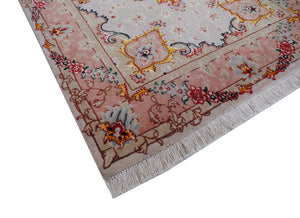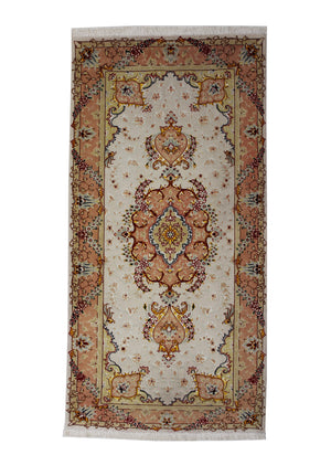 Dieser Teppich kommt aus der persischen Stadt Täbriz, welche im Nordwesten des Irans liegt. Durch die generationsübergreifenden Knüpf-Familien gilt diese Stadt als eine der ältesten Teppichzentren der Welt. Beliebt wurden diese Teppiche vor allem durch die exklusiven Muster und Materialen von Schur-Korkwolle und Naturseide. Farblich passen die Stücke ideal zum heutigen Einrichtungsstil, da überwiegend dezente Pastellfarben verwendet werden. Gewisse Stücke werden allerdings bewusst sehr farbenfroh und reich verziert an Motiven geknüpft, sodass sie von Kunstwerken nicht zu unterscheiden sind. Die Feinheit dieser Teppiche wird in Raj angegeben und so unterscheidet man von 40Raj – 70Raj. Die feinste Knüpfung sind 70Raj mit knapp 1 000 000 Knoten pro Quadratmeter. Die dichte Knüpfung und die hervorragenden Materialen sorgen dafür, dass der Teppich sehr strapazierfähig und langlebig ist.