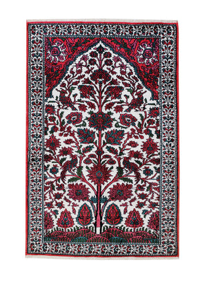 Dieser Teppich stammt aus Kaschmir, wo bekannte persische Provenienzen als Vorlage dienen. Hochwertige Materialen wie Wolle und Seide sorgen dafür, dass diese Teppiche sehr beliebt bei Teppichliebhabern geworden sind. Das typische Motiv besteht meist aus einem Medaillon oder dem Gartenmotiv. Je nach Feinheit wird für den Schuss Baumwolle oder sogar reine Seide verwendet. Die Seide lässt die Farben je nach Lichteinfall in verschiedensten Facetten erstrahlen und wird dadurch zum absoluten Highlight in jedem Raum. Die dichte Knüpfung und Materialen sorgen dafür, dass der Teppich sehr strapazierfähig und langlebig ist.