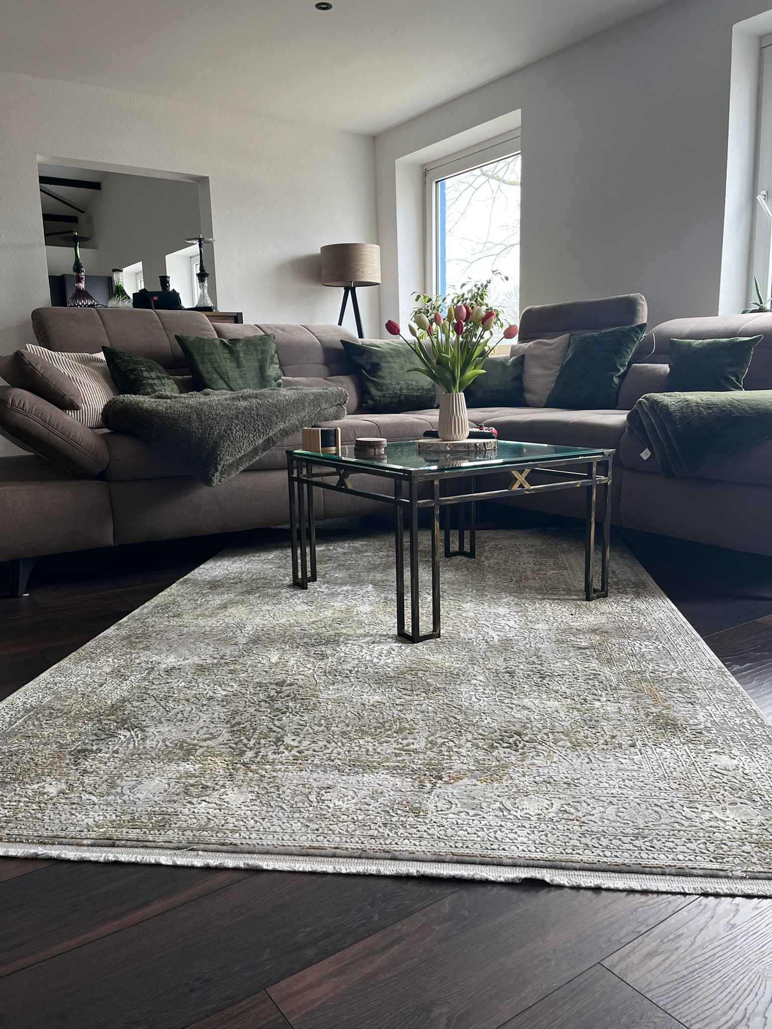 Bei dieser schönen Einrichtung, wurden moderne und klassische Elemente kombiniert. Passend dazu wurde der Designerteppich MINA DREAM in grün dazu kombiniert. Das tolle 3D Motiv bringt Eleganz und ruhe in das Wohnzimmer.
