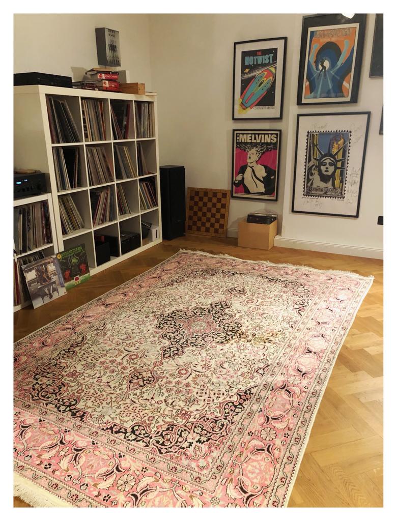 Diese schöne retro Einrichtung wurde mit einem Vintage Kaschmir Seiden Teppich kombiniert. Dadurch dass der Teppich frei liegen kann und keine Möbel draufkommen, kommt das Medaillon Motiv voll zur Geltung.
