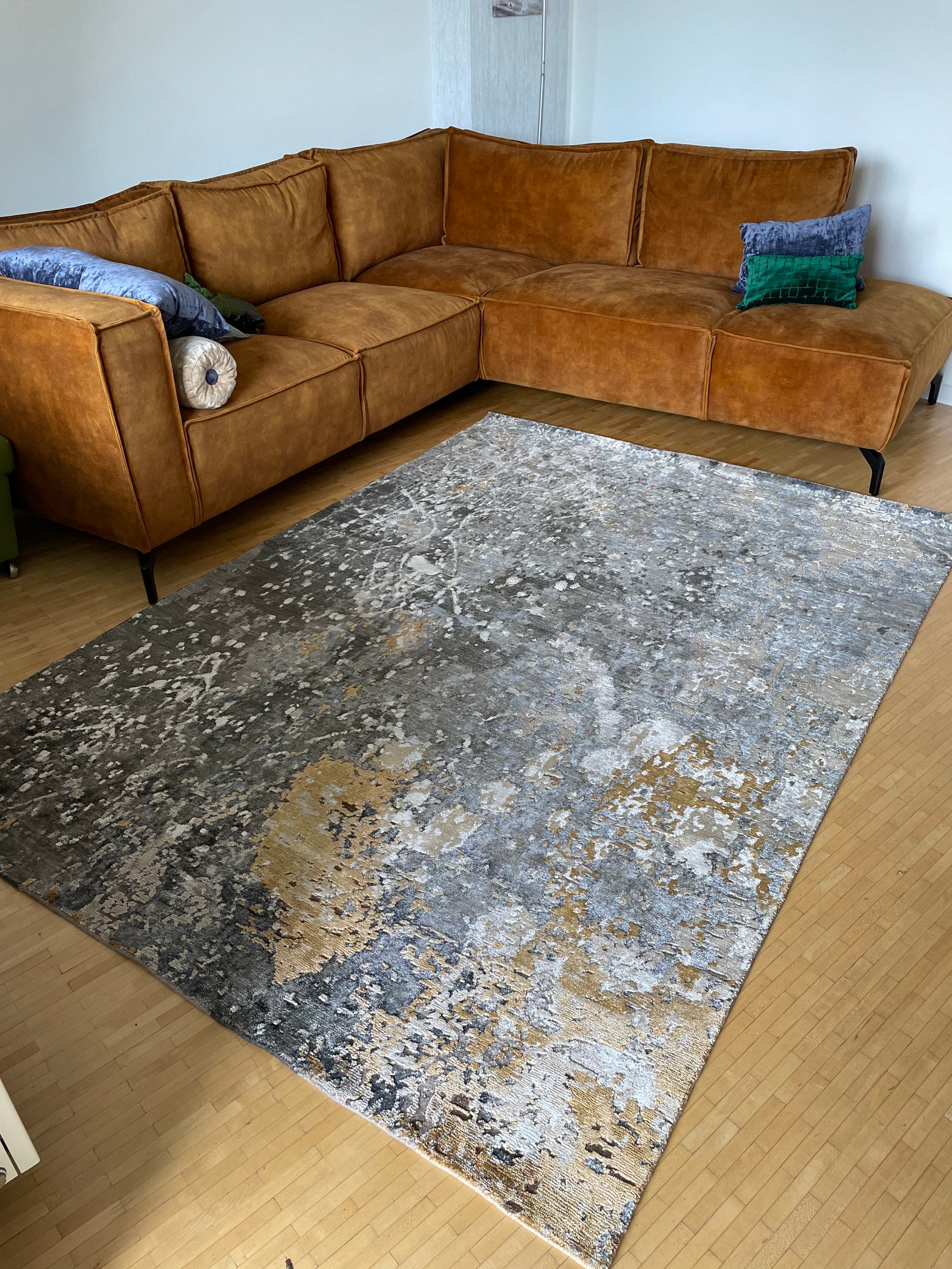 Bei diesem schönen Kundenprojekt wurde unser Designer TeppichMoonstoneNugget gewählt. Entscheidend waren die goldenen Elemente, die der kühleren grauen Grundfarbe des Teppichs Farbe Wärme verleiht.