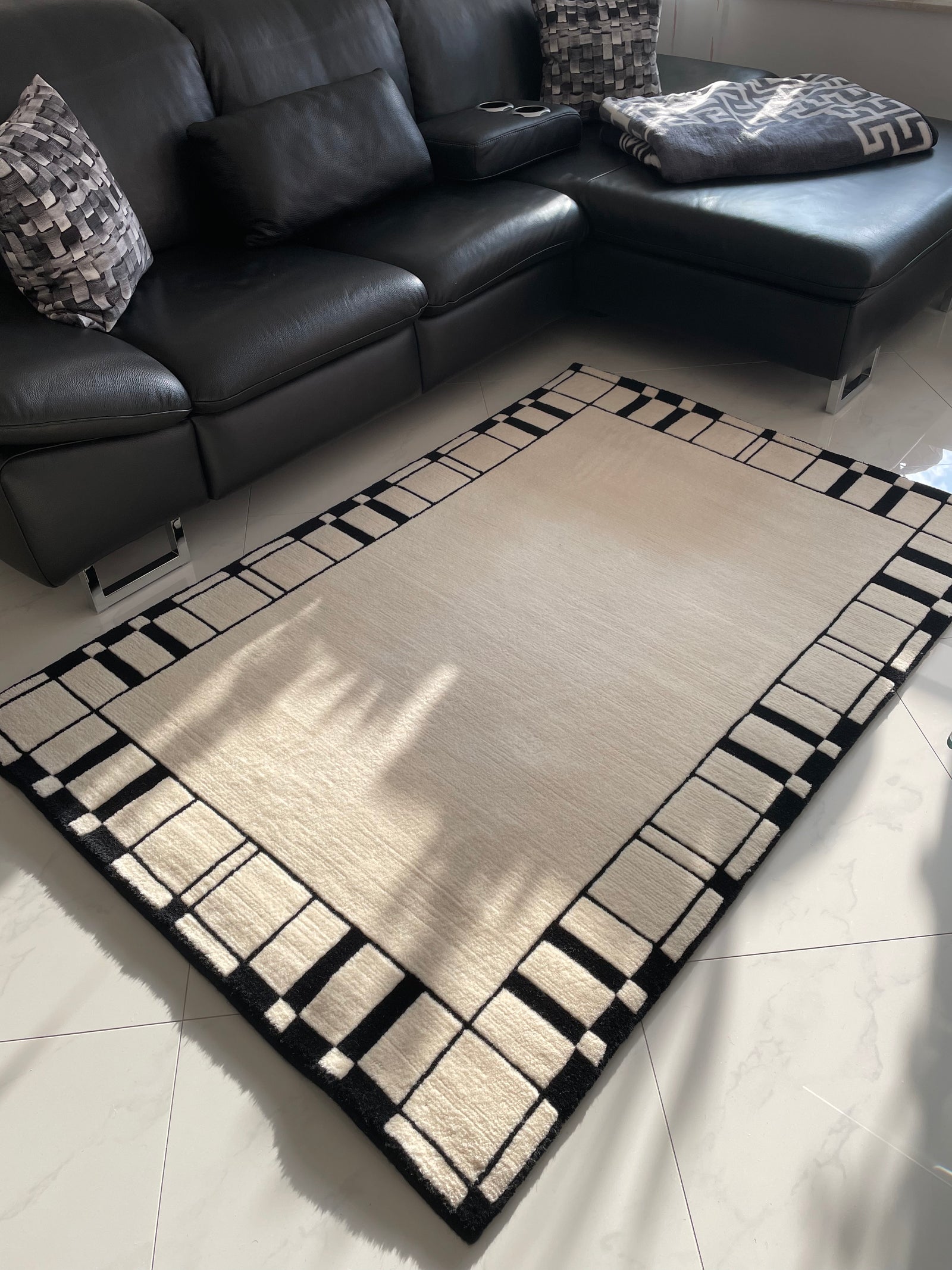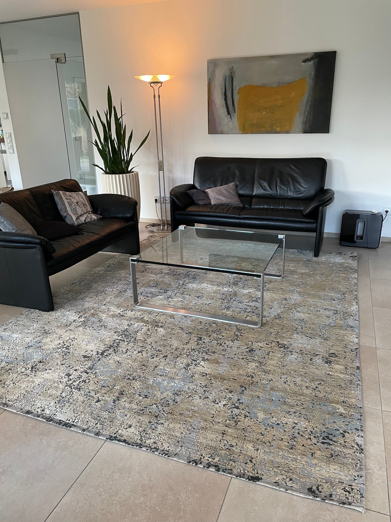Dieses moderne und lichtdurchflutete Wohnzimmer wurde mit einem sehr feinen Designer Teppich verschönert. Der hohe