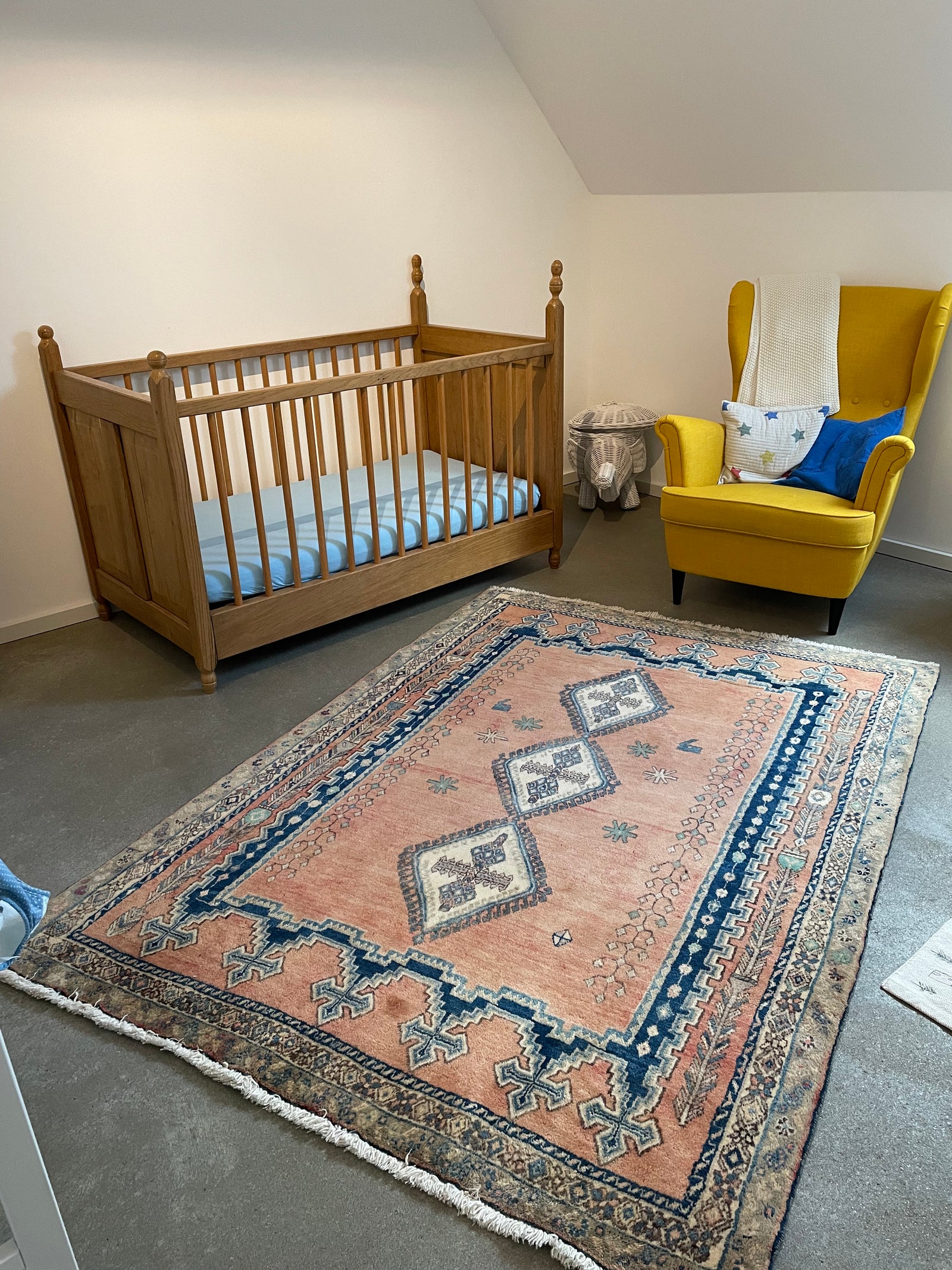 In diesem schönen Kinderzimmer ist die Wahl auf einen Orientteppich aus unserer Vintage Kategorie gefallen. Der Teppich sollte traditionelle Motive haben und aus reiner Schurwolle sein, damit er pflegeleicht ist.
