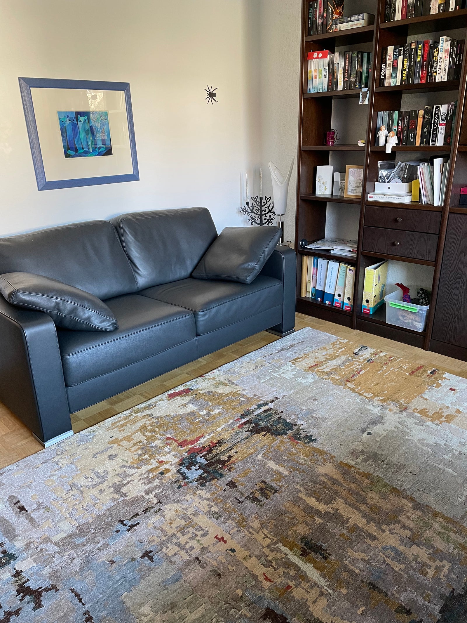 Zu sehen ein Designer Teppich im Arbeitszimmer, die Kombination aus hellen und gedeckten Farben sorgen für frische und Abwechslung. Hierbei ist auf das Maß zu achten, wir empfehlen ein größeres Maß, damit der Schreibtischstuhl auch unproblematisch zu bewegen ist.