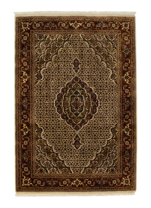 Dieser Teppich kommt aus Indien, wo bekannte persische Provenienzen als Vorlage dienen. Anders als beim persischen Vorbild, welches in der Stadt Tabriz geknüpft wird, kommt dieser aus indischen Manufakturen. Das elegante Design mit nur minimalen Motiven macht diesen Teppich zeitlos und modern. Die dichte Knüpfung und Materialen sorgen dafür, dass der Teppich sehr strapazierfähig und langlebig ist.